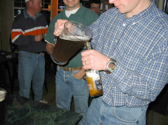 Will, Dan, Craig, Stu. Stu is trying to perform the same stunt he learned in college. That pitcher of beer was one of the ones that Paul Jr. of Finnegan's bought for us. What a guy, eh?